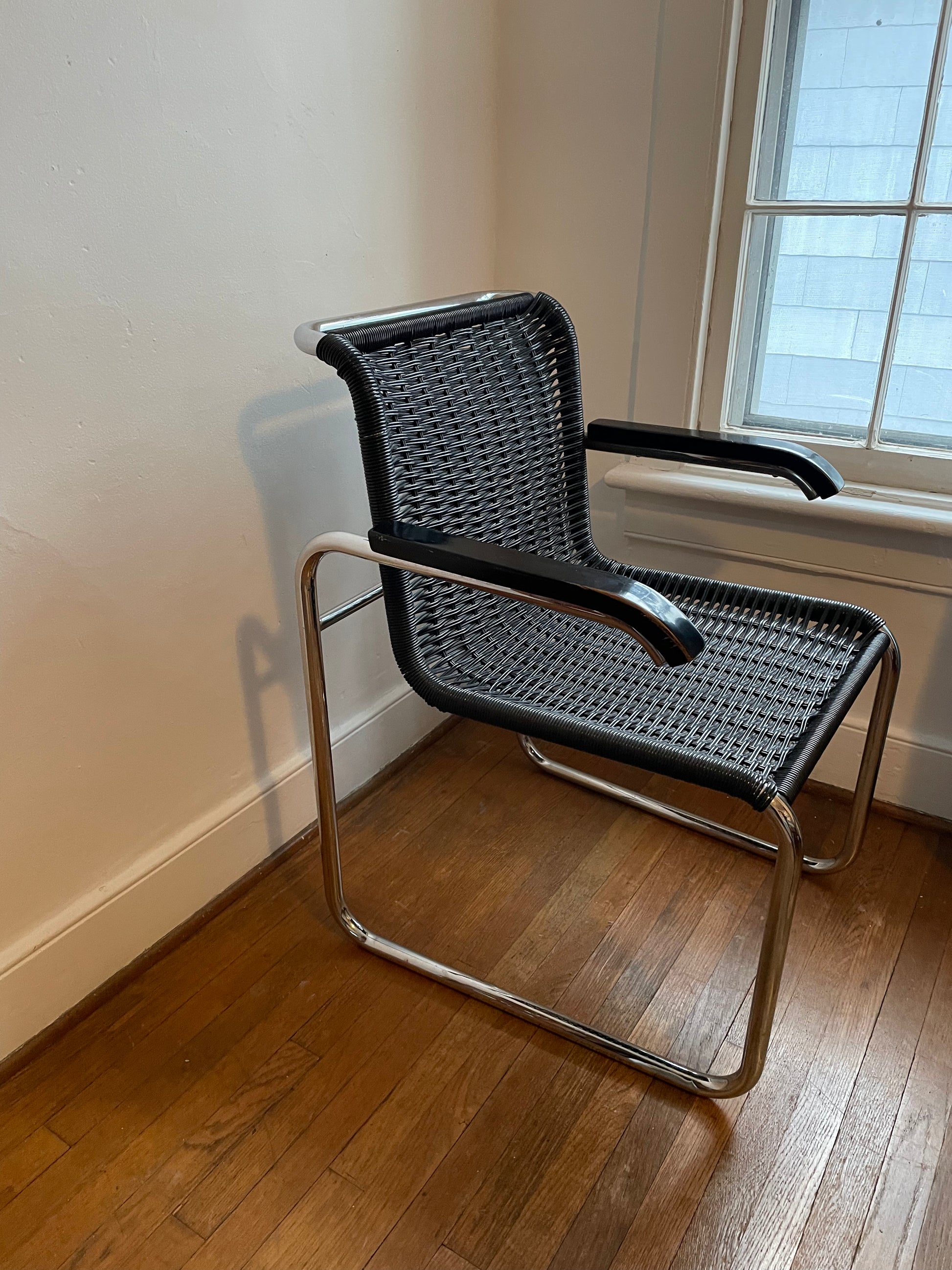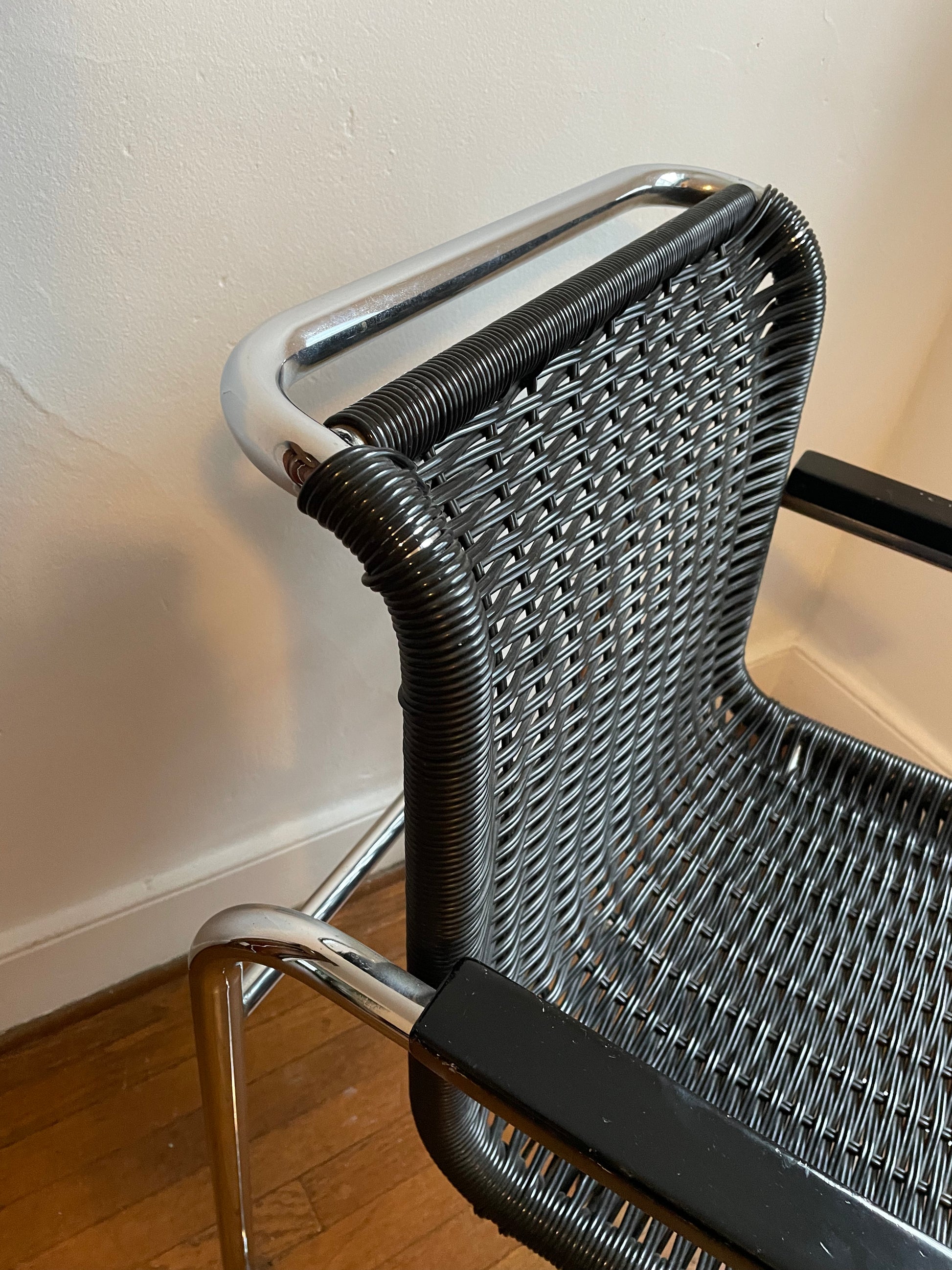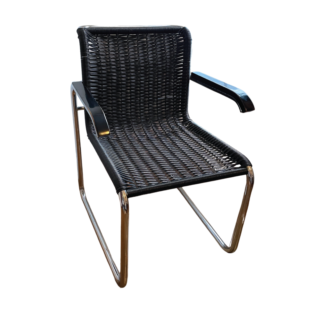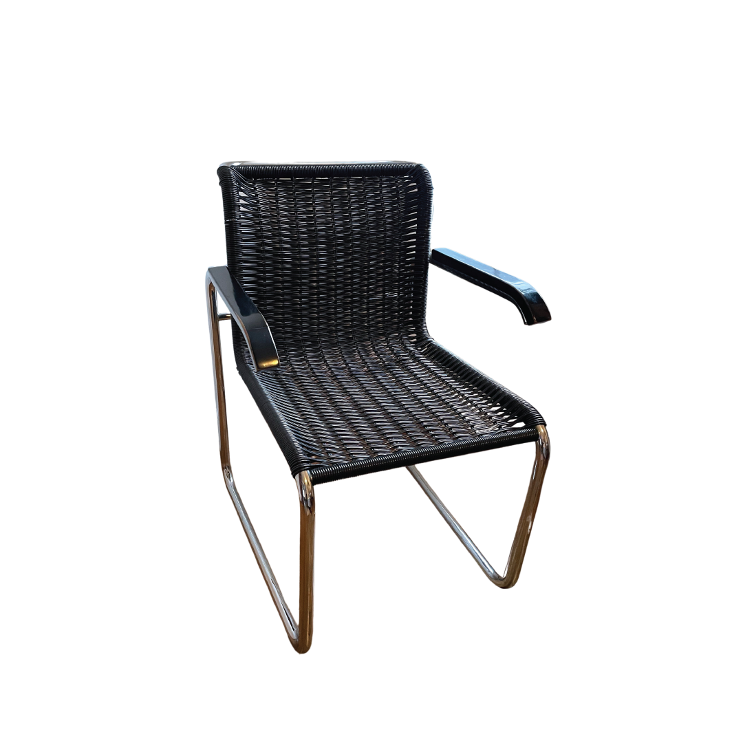 A stunning, 1980s Bauhaus-style armchair. Dining height. Chrome frame, wooden arms and black plastic woven seat. Possibly German brand Tecta. Some wear on arms but overall chair is in great condition.