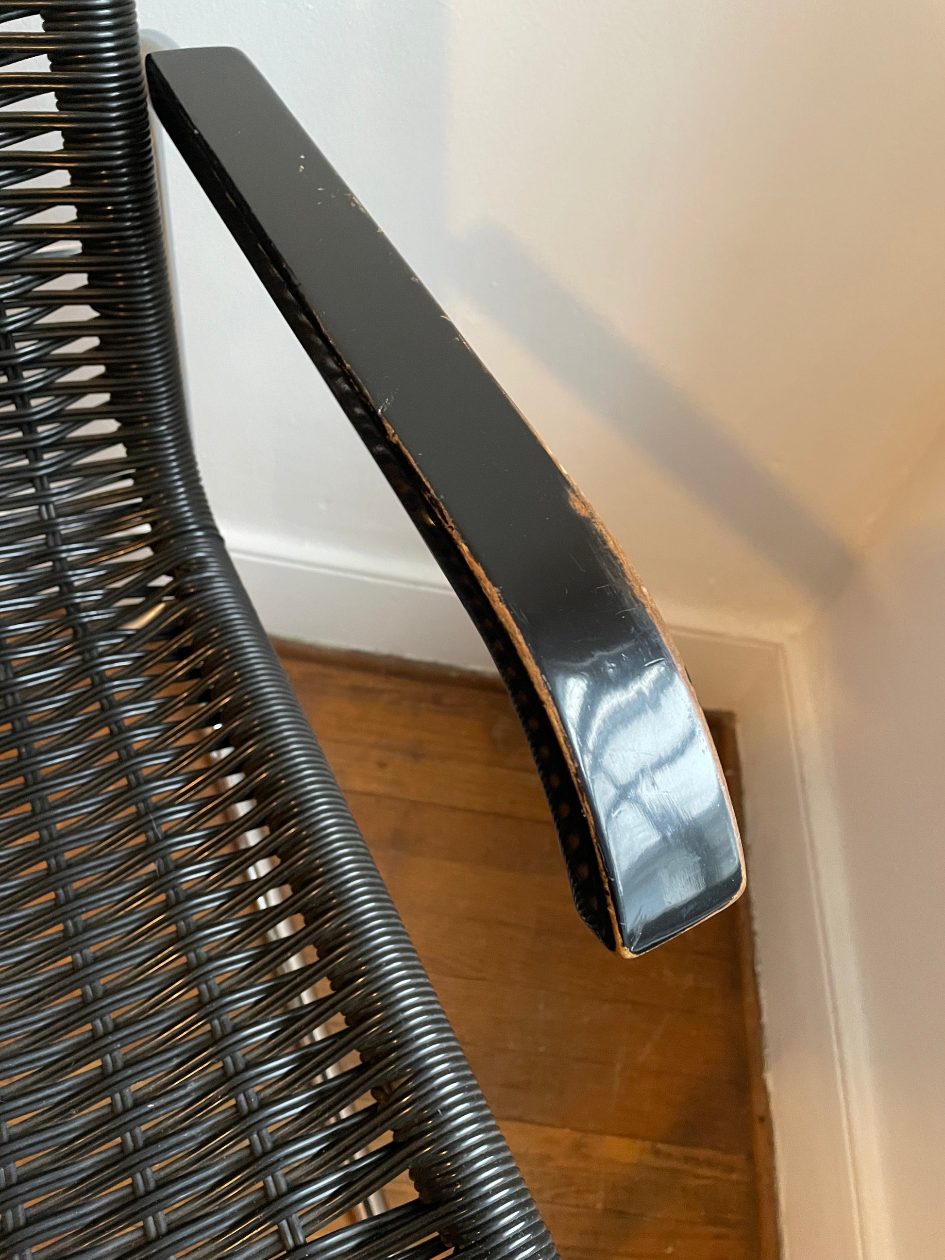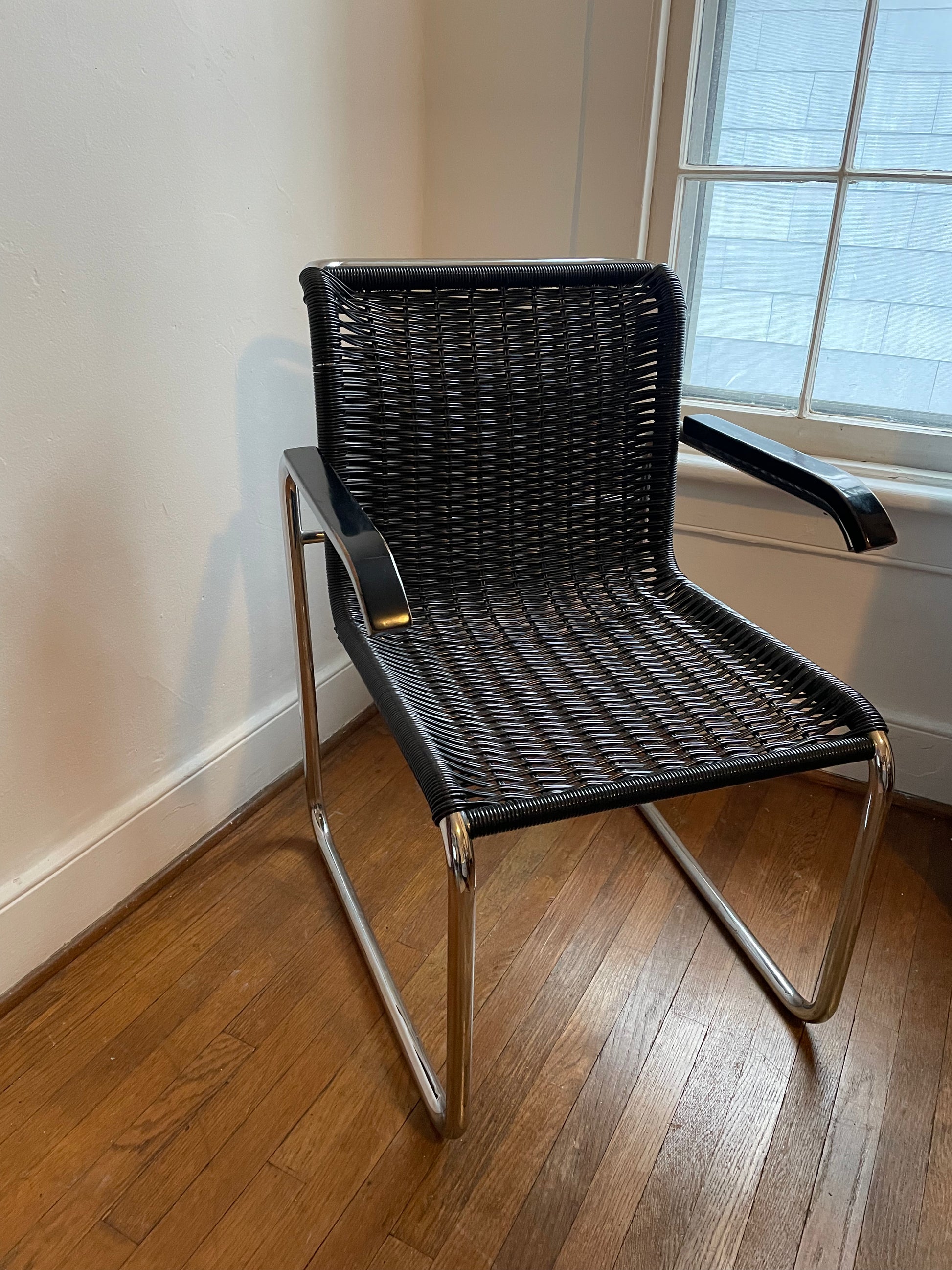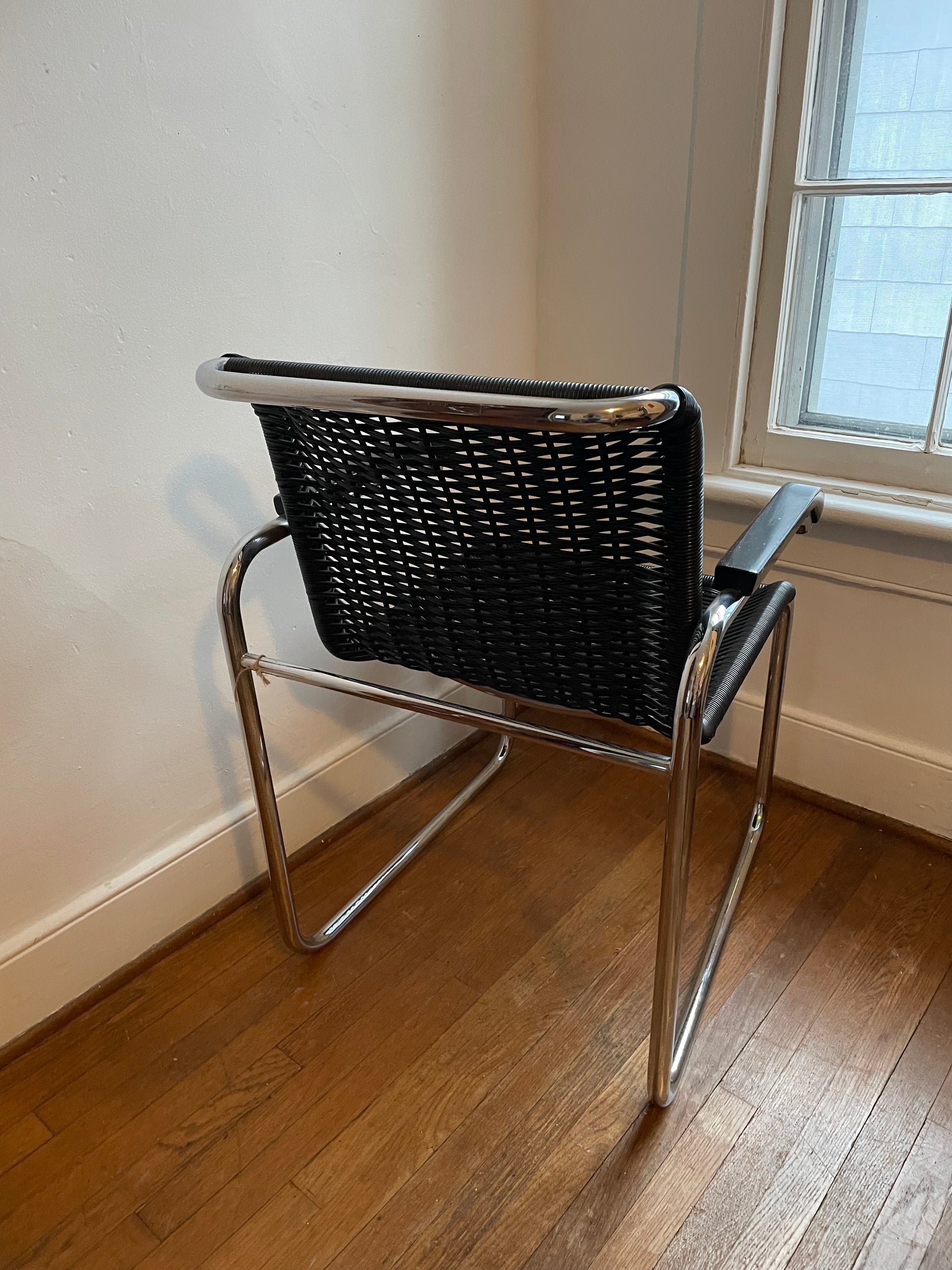 A stunning, 1980s Bauhaus-style armchair. Dining height. Chrome frame, wooden arms and black plastic woven seat. Possibly German brand Tecta. Some wear on arms but overall chair is in great condition.