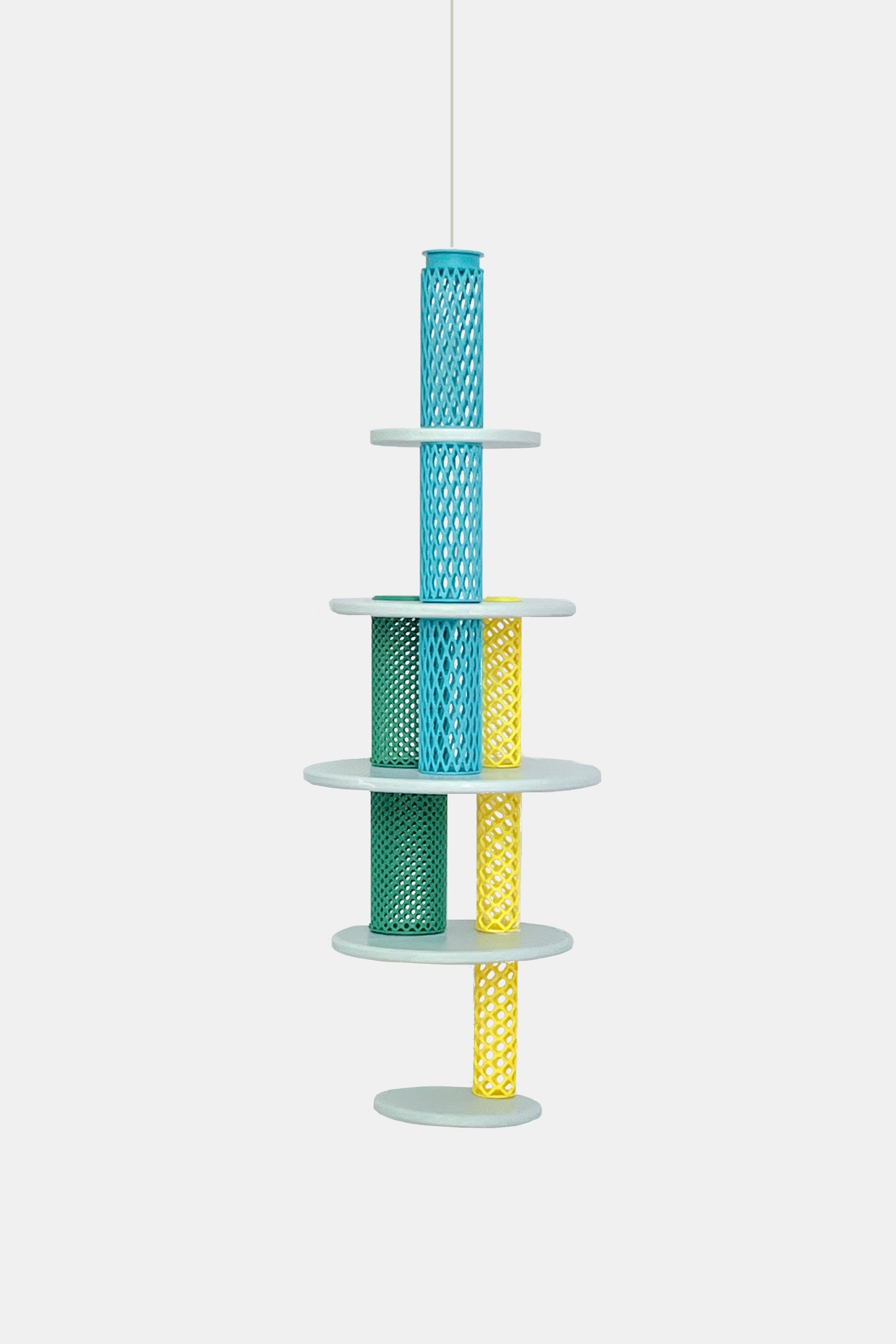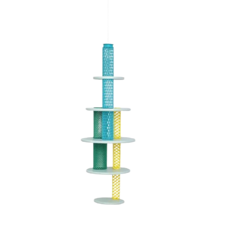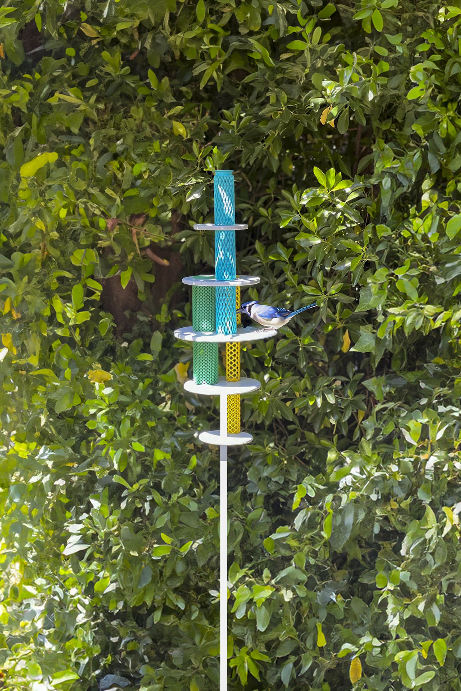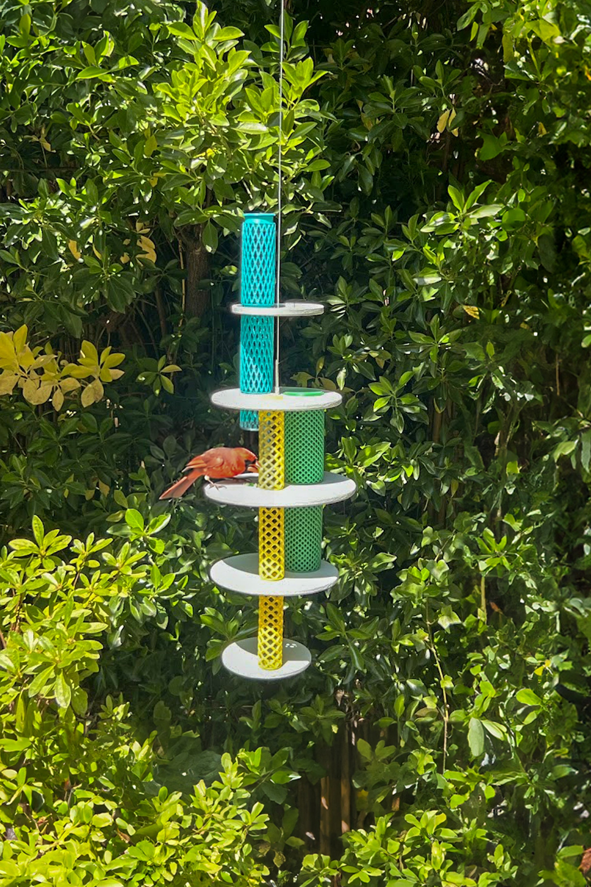 Flatter Freund by STUDIO FOU is more than just a bird feeder - it's a whole experience for birds. It features three color-coded feeding stations with openings of various sizes, allowing for different types of food and birds, as well as a shallow bathing station at the top. Made from reclaimed wood, 3D printed ASA polymer and steel. Shown hanging but can also be pole-mounted. Made for the 2025 'Animal House' exhibition at Available Items.