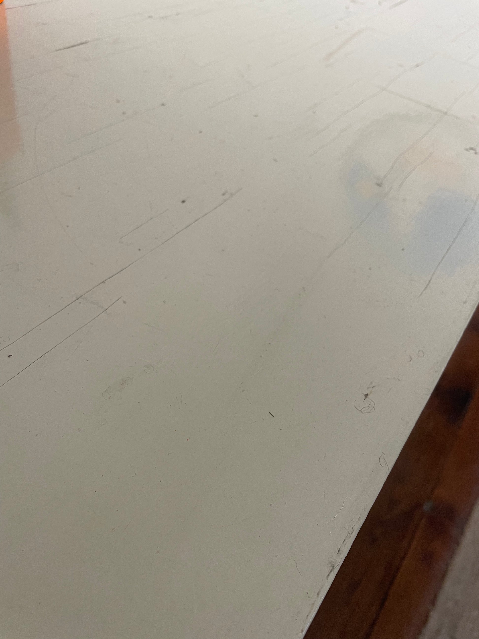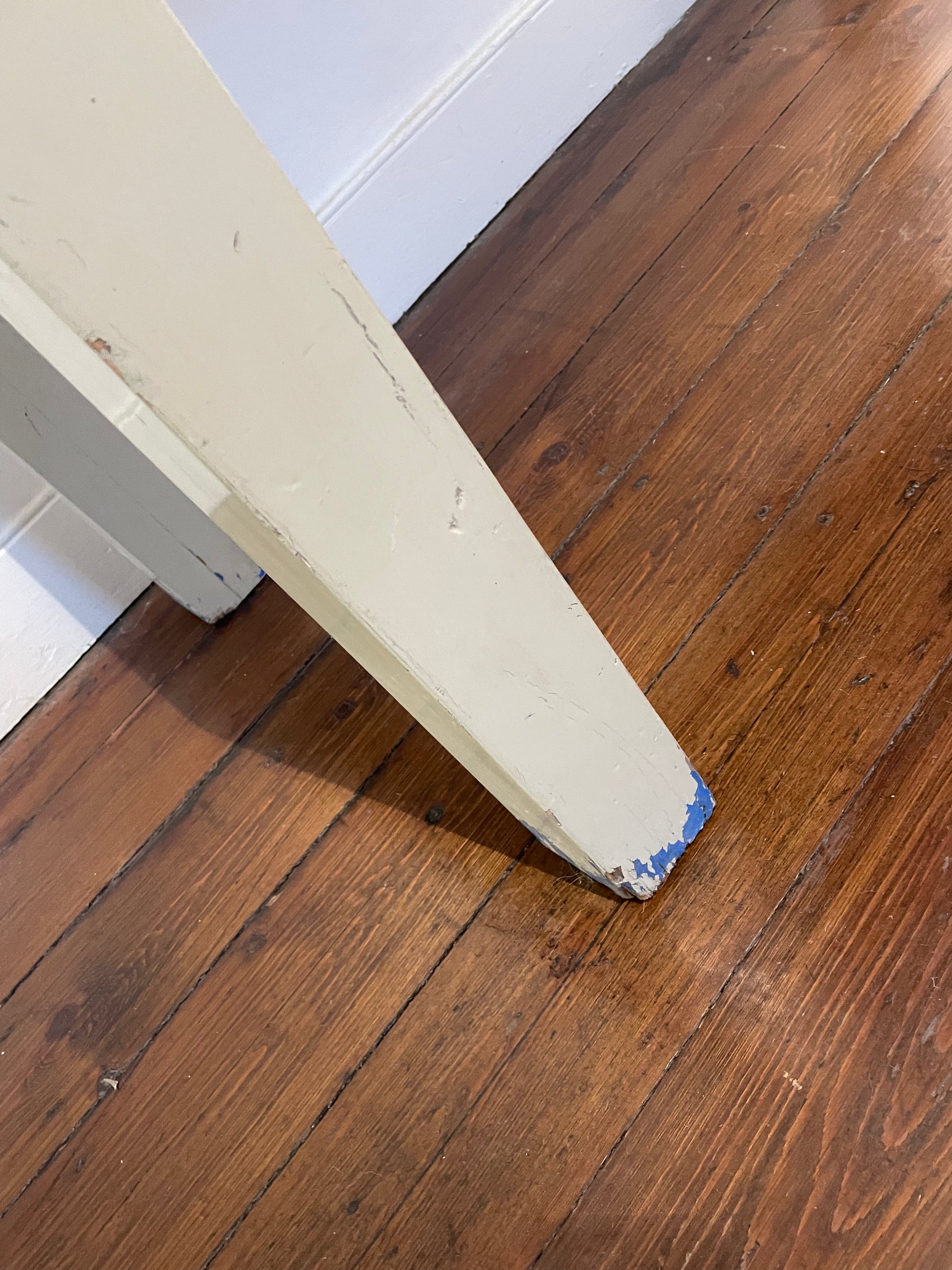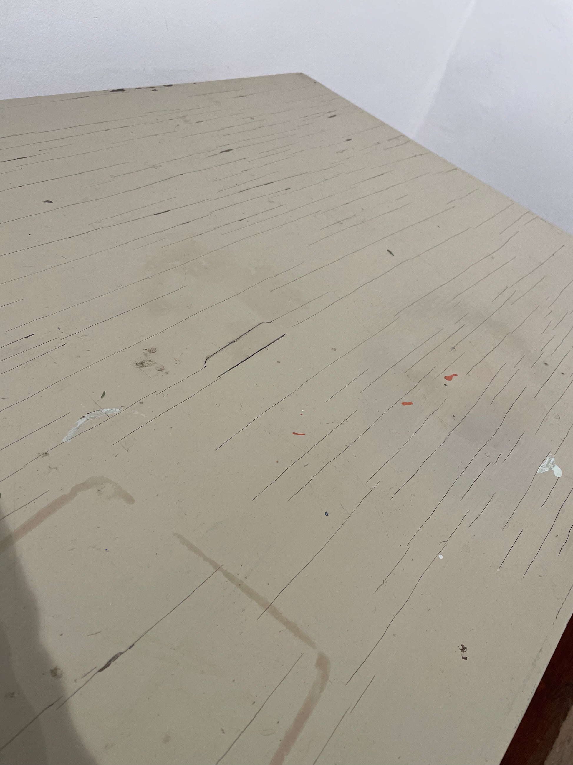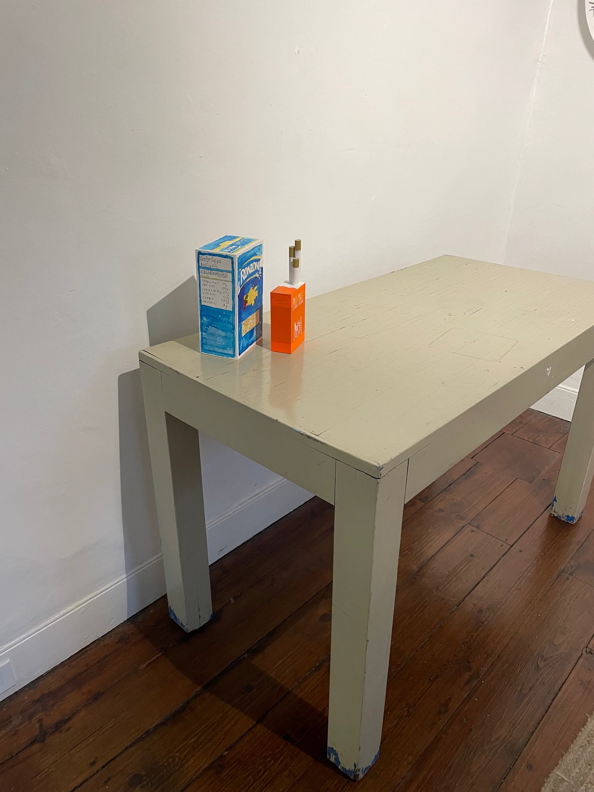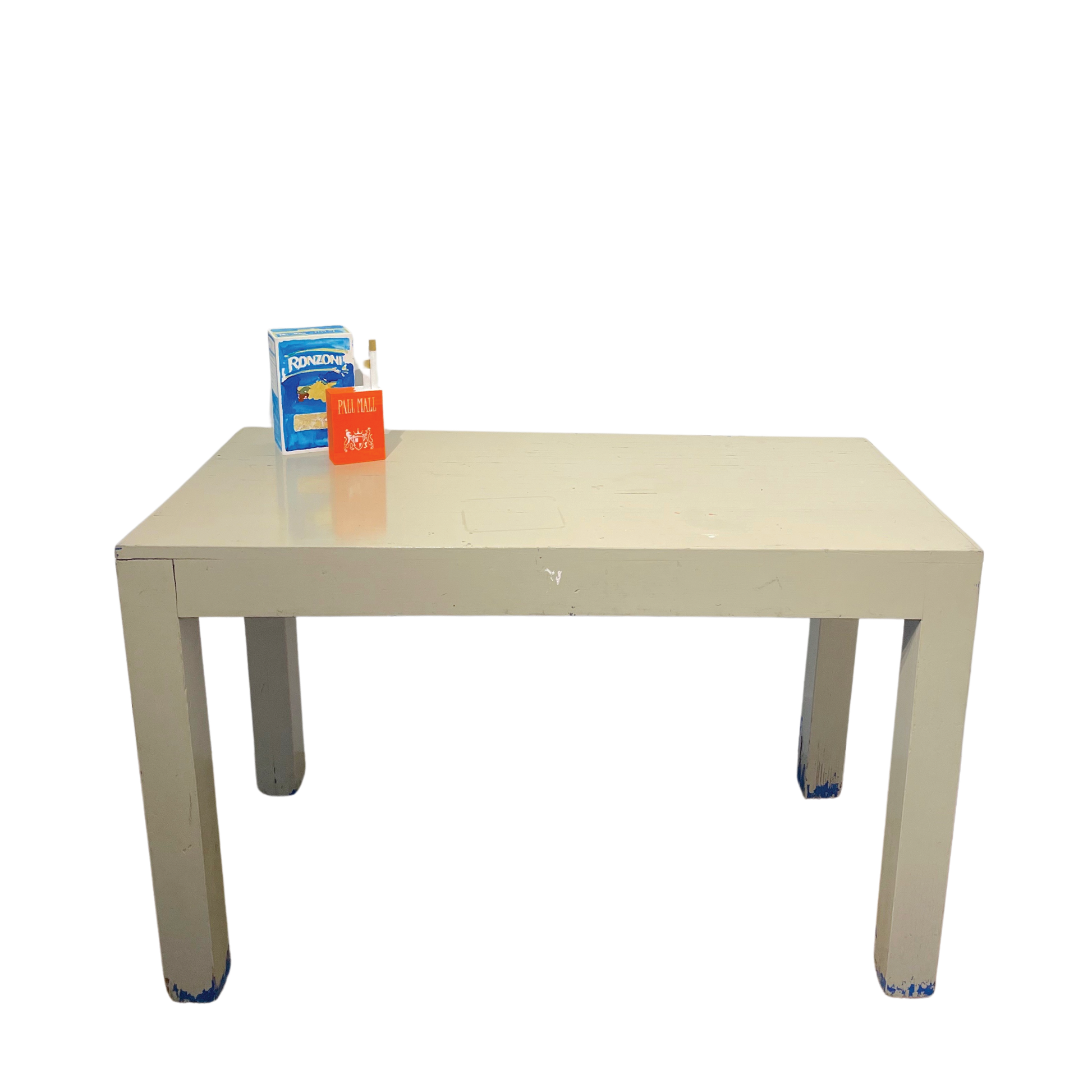 Vintage Parsons table with perfectly crackly painted (but solid) surface. Solid table with blue paint peaking through in areas. Makes a great desk (artwork by Laurene Boym, not included.)