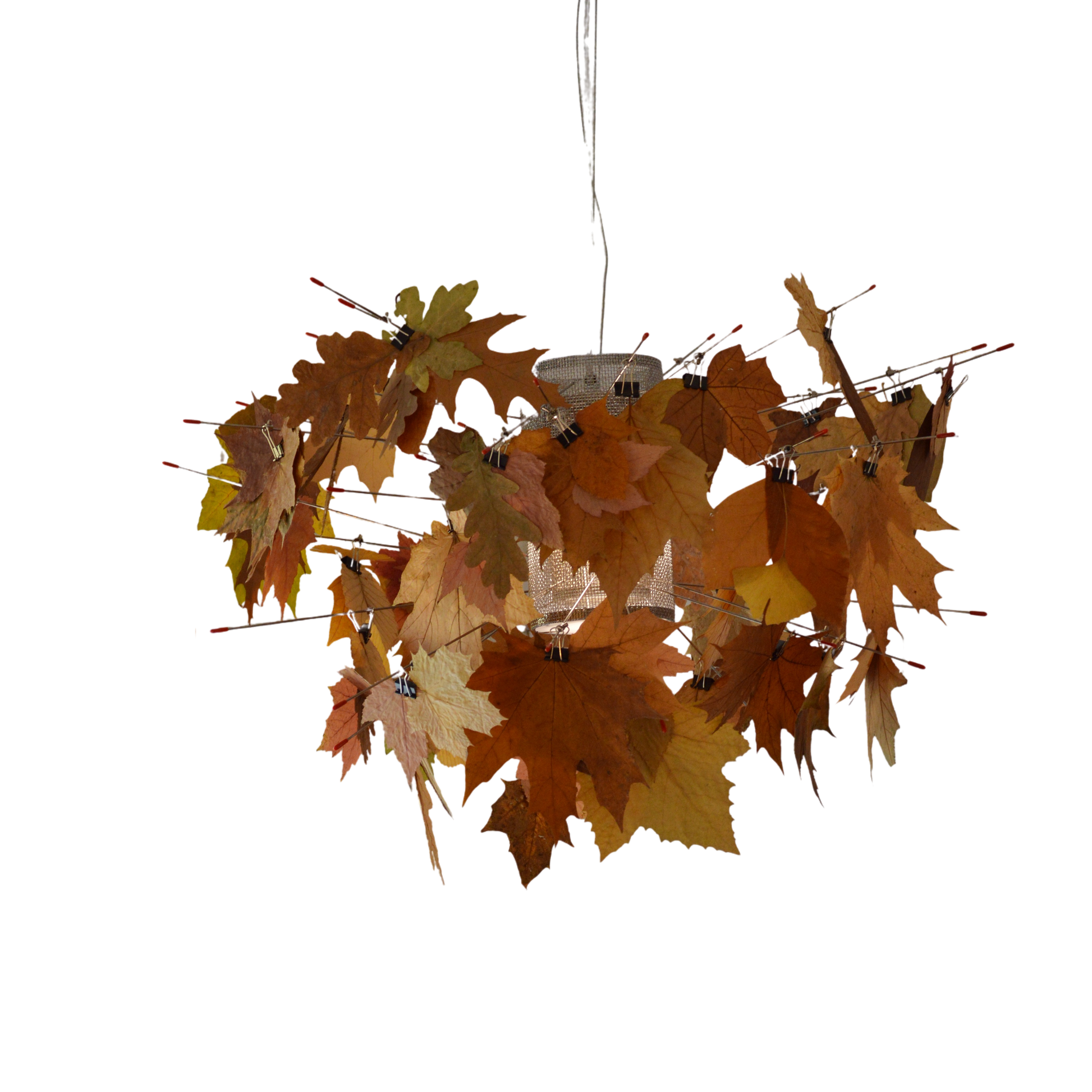 Made for the 2024 Silence of the Lamps exhibition at Available Items, the Leaf Peep pendant by lighting designer Charles Brill is an autumnal homage to Ingo Maurer’s Zettle’z chandelier. It features a stainless steel frame and dozens of pressed fall leaves.