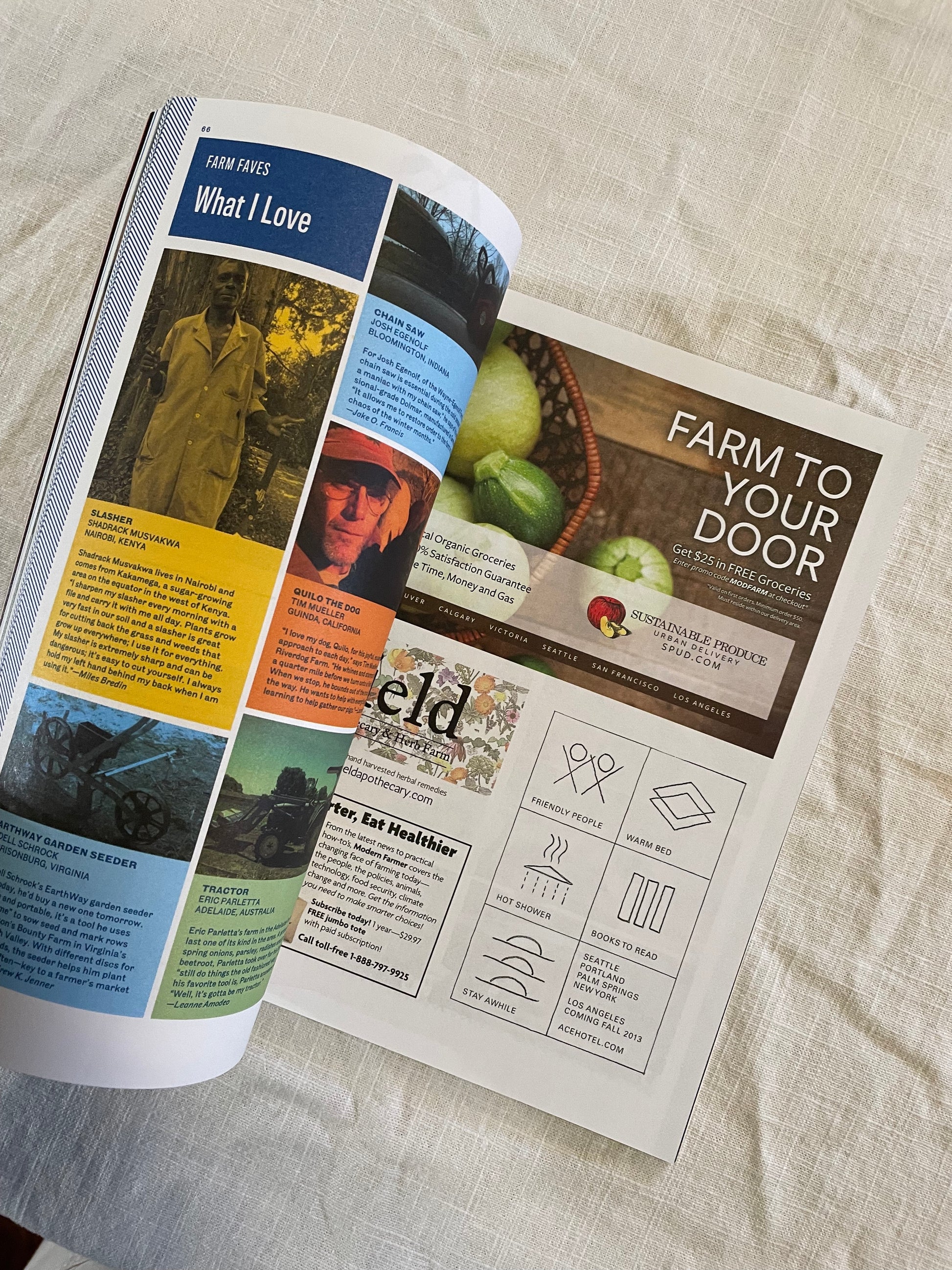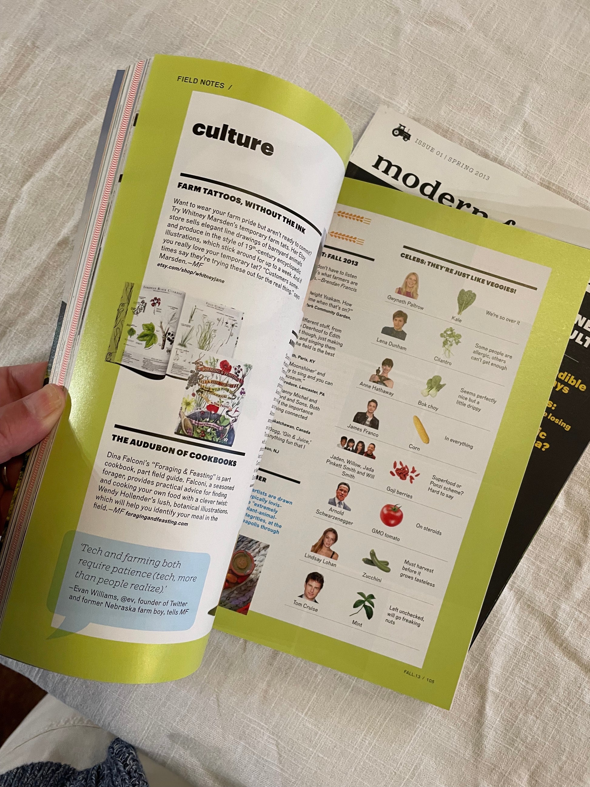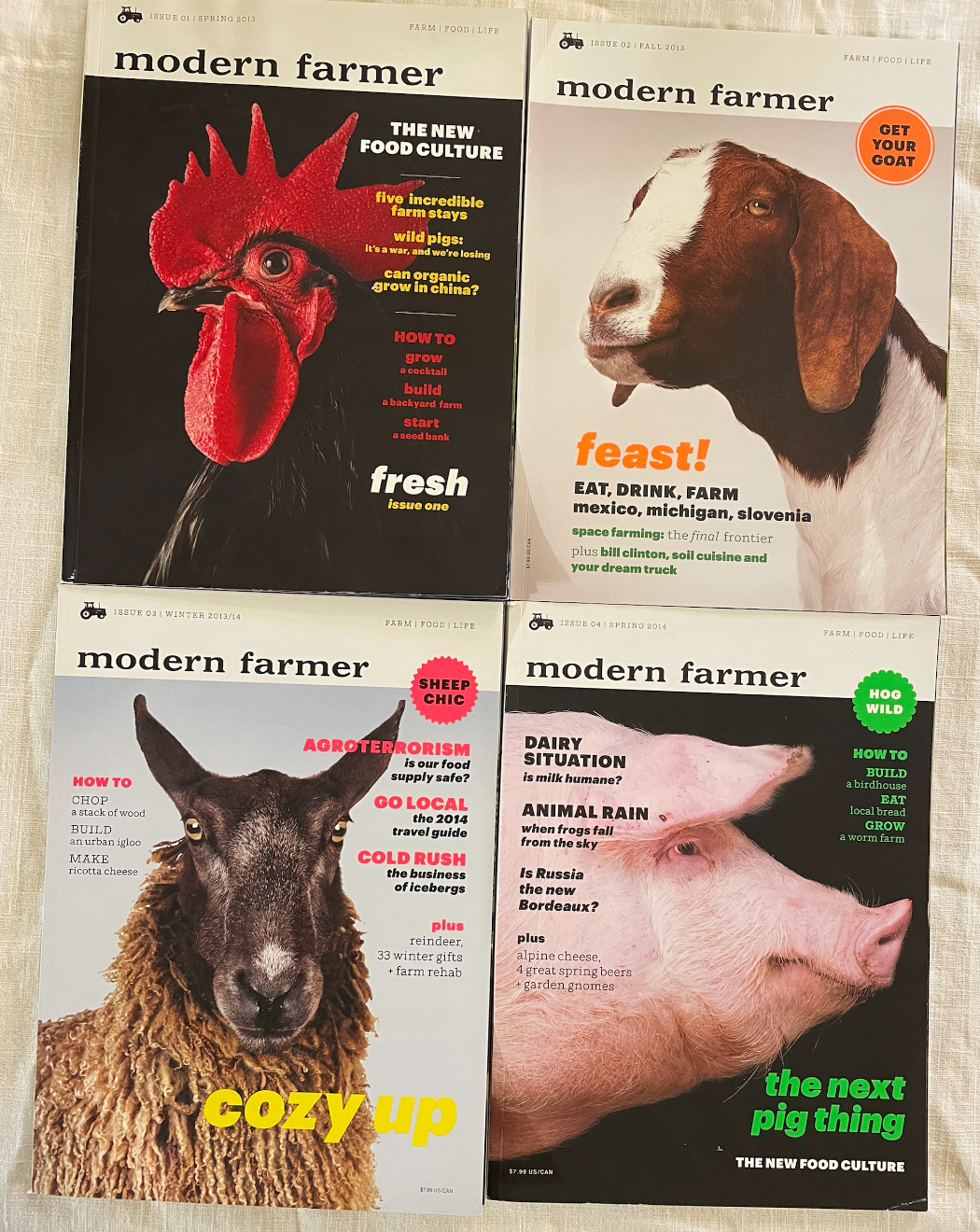 Modern Farmer covers feature livestock and its articles include those like a series of interviews with agriculture ministers from around the globe. Its stories tend to take a "farm to table" perspective, comprehensively covering food and agriculture topics like Greek yogurt or feral pigs. In addition to the print magazine, it has a popular website; its "goatcam," a public web cam of goats, produced 60,000 page views alone.