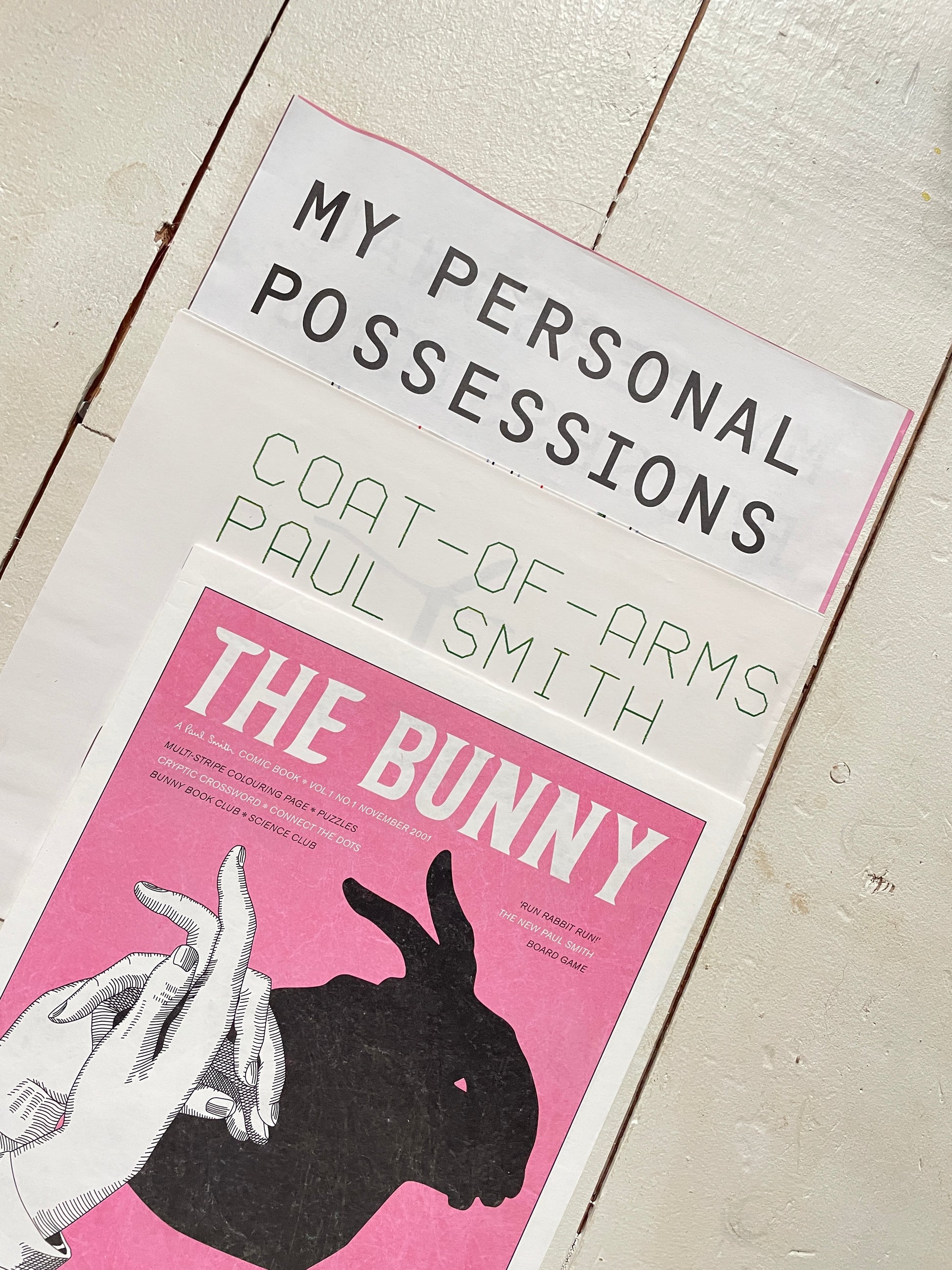 The hardcover book is in perfect condition, housed inside a Styrofoam clamshell. The book also includes a Paul Smith branded magnifying glass and three inserts. 1. My Personal Possessions; 2. The Bunny A Paul Smith™ Comic Book * Vol. 1 No 1 November 2001; 3. Coat of Arms, coat pattern.