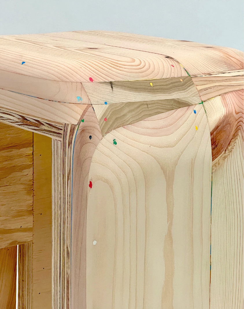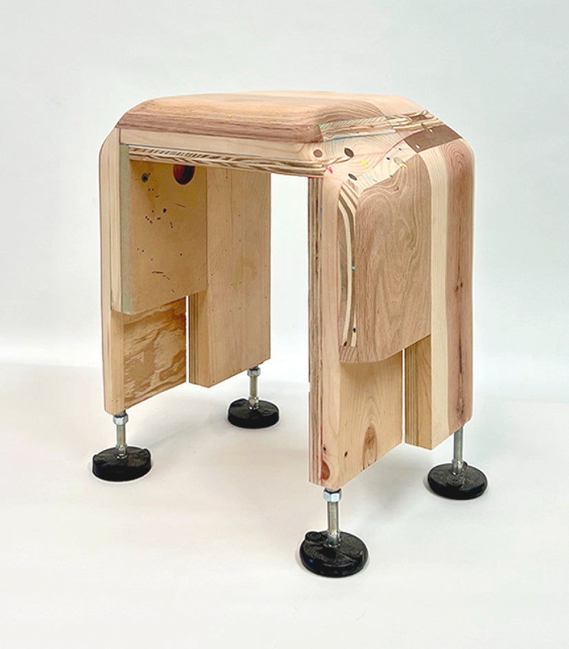 Stool/side table by Outgoing. Made from laminations of many hard and soft woods alongside a variety of plywoods and finished by hand with a natural oil finish. All nail holes, voids and gaps in the wood are filled with a special blend of pigment and spackle, creating a subtle surface detail of multi-colored dots.