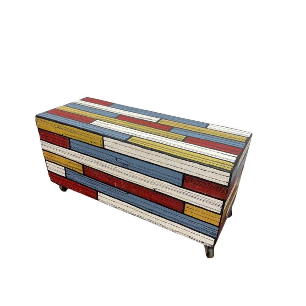 Vintage wooden foot locker on wheels with a hand painted, pop art-inspired faux bois pattern.
